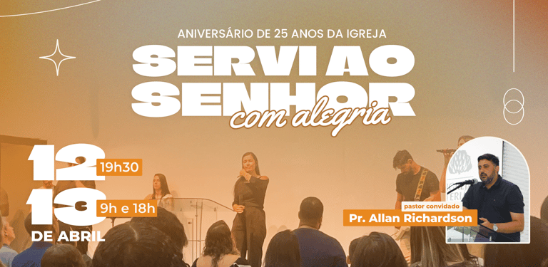 Neste ano, nossa festividade traz o tema: “Servi ao Senhor com alegria” (Sl 100.2). Queremos juntos refletir sobre como a alegria em servir transforma nossa vida espiritual e nossa comunidade. Será um tempo precioso de louvor, comunhão e aprendizado com a participação do Rev. Allan Richardson.